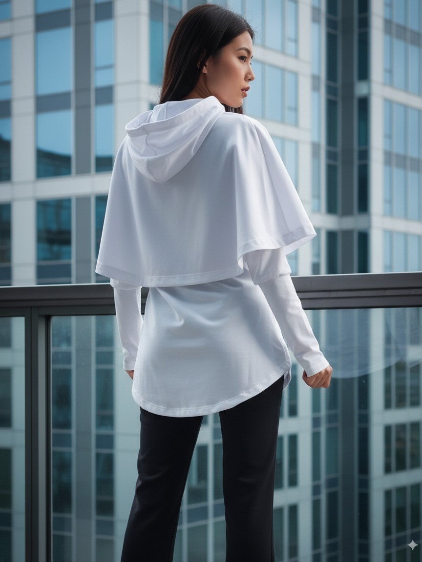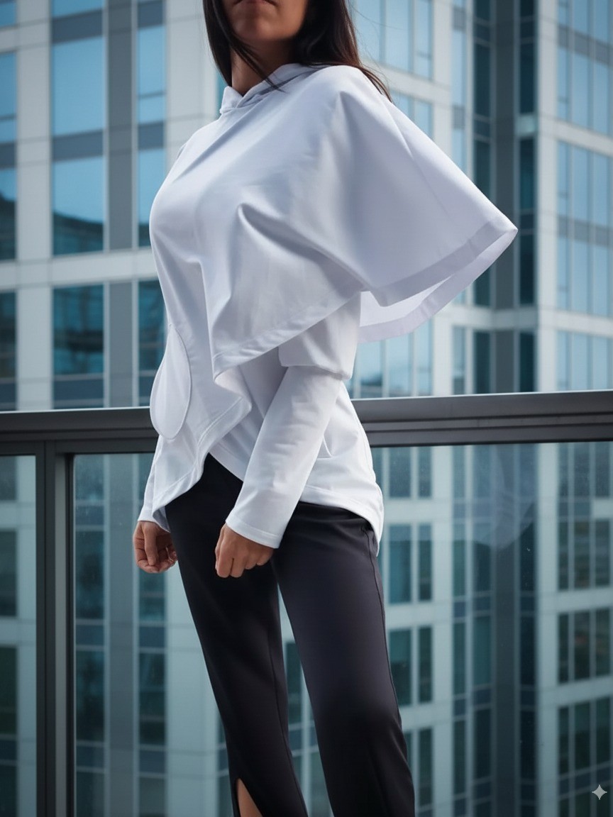 Un Hoodie diferente elegante pero casual con detalle de capa que cruza hacia adelante, corte asimétrico. Bolsillos y capota.