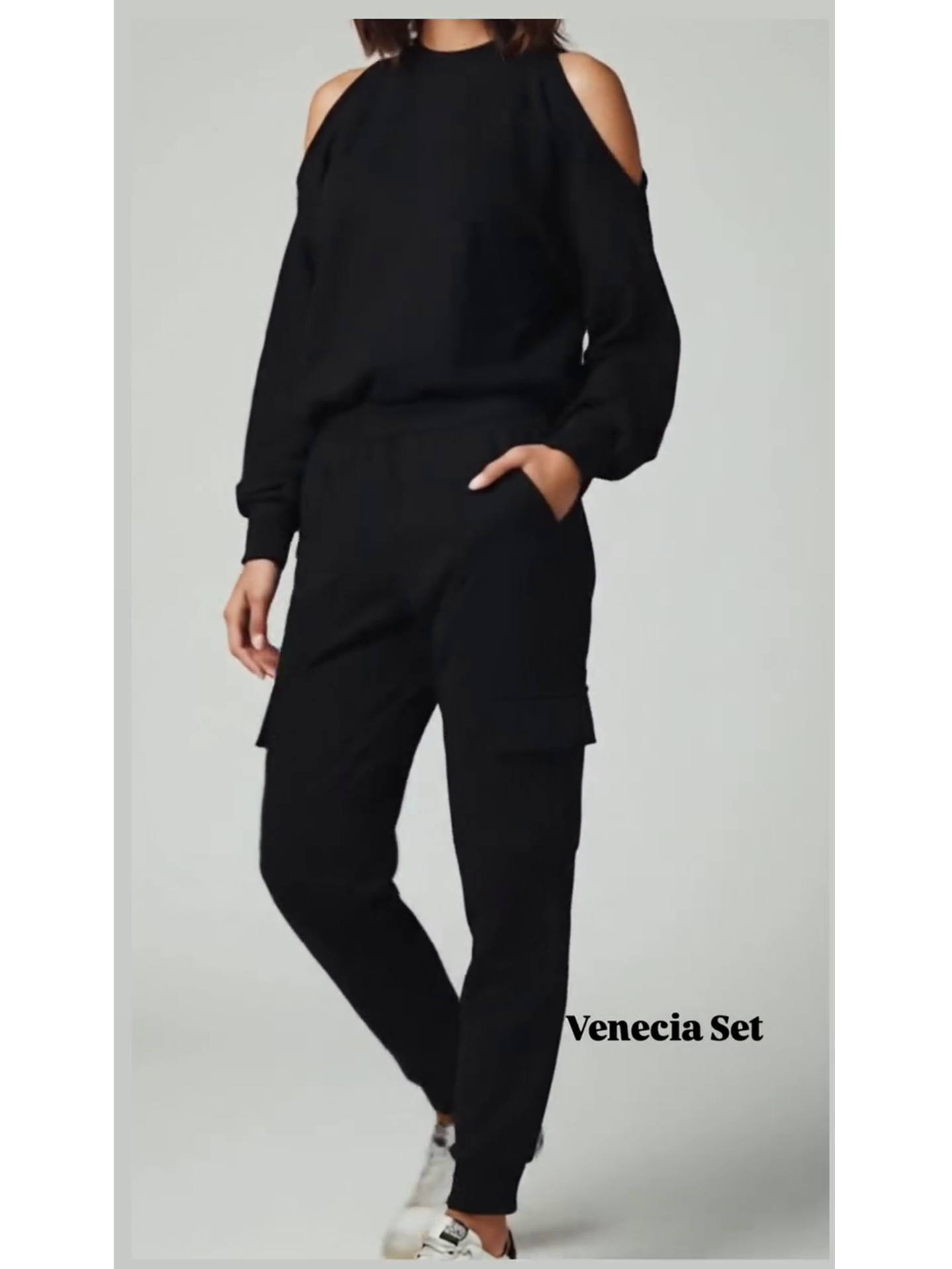 Hoodie Venecia, cuello redondo , recortes cut-out en los hombros y mangas con volumen que rematan en puños cerrados. La pretina ancha permite llevarlo holgado o recto a la cadera, ideal para un look athleisure limpio que funciona con el jogger a juego, jeans o falda midi.