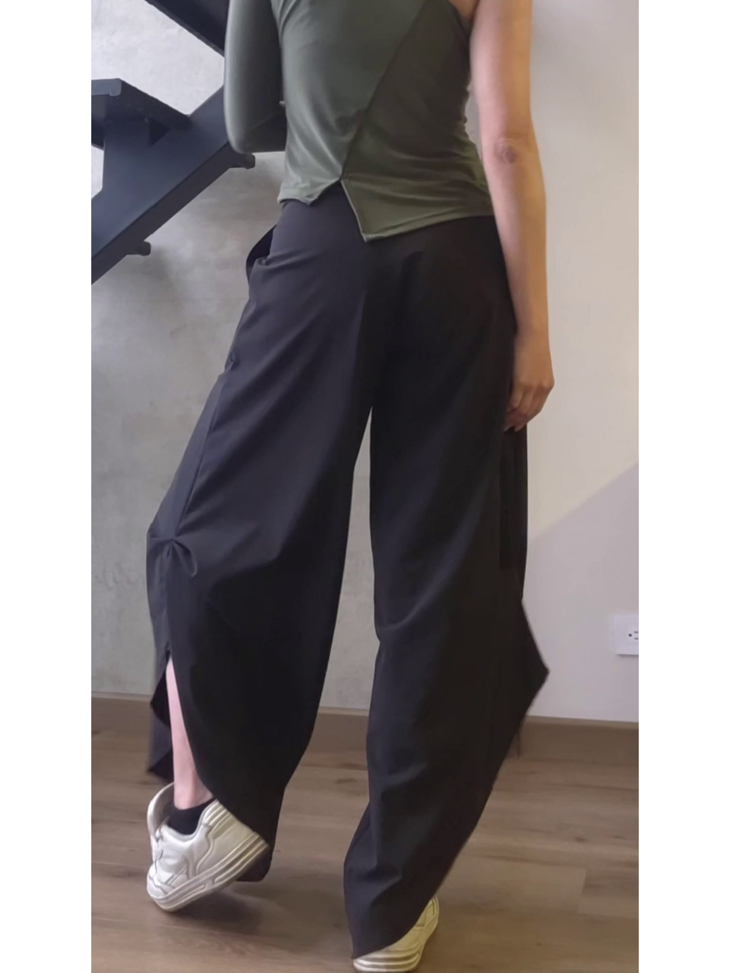 Comodidad con presencia. Este pantalón con corte diagonal y detalle de recogido en ambos costados combina el espíritu del athleisure con un corte sastre relajado. Con una pretina cruzada en la parte de adelante, su estructura fluida y cintura ajustada aportan movimiento y estilo, mientras su tela ligera ofrece confort durante todo el día. Perfecto para combinar con tops ajustados o camisas oversize.
