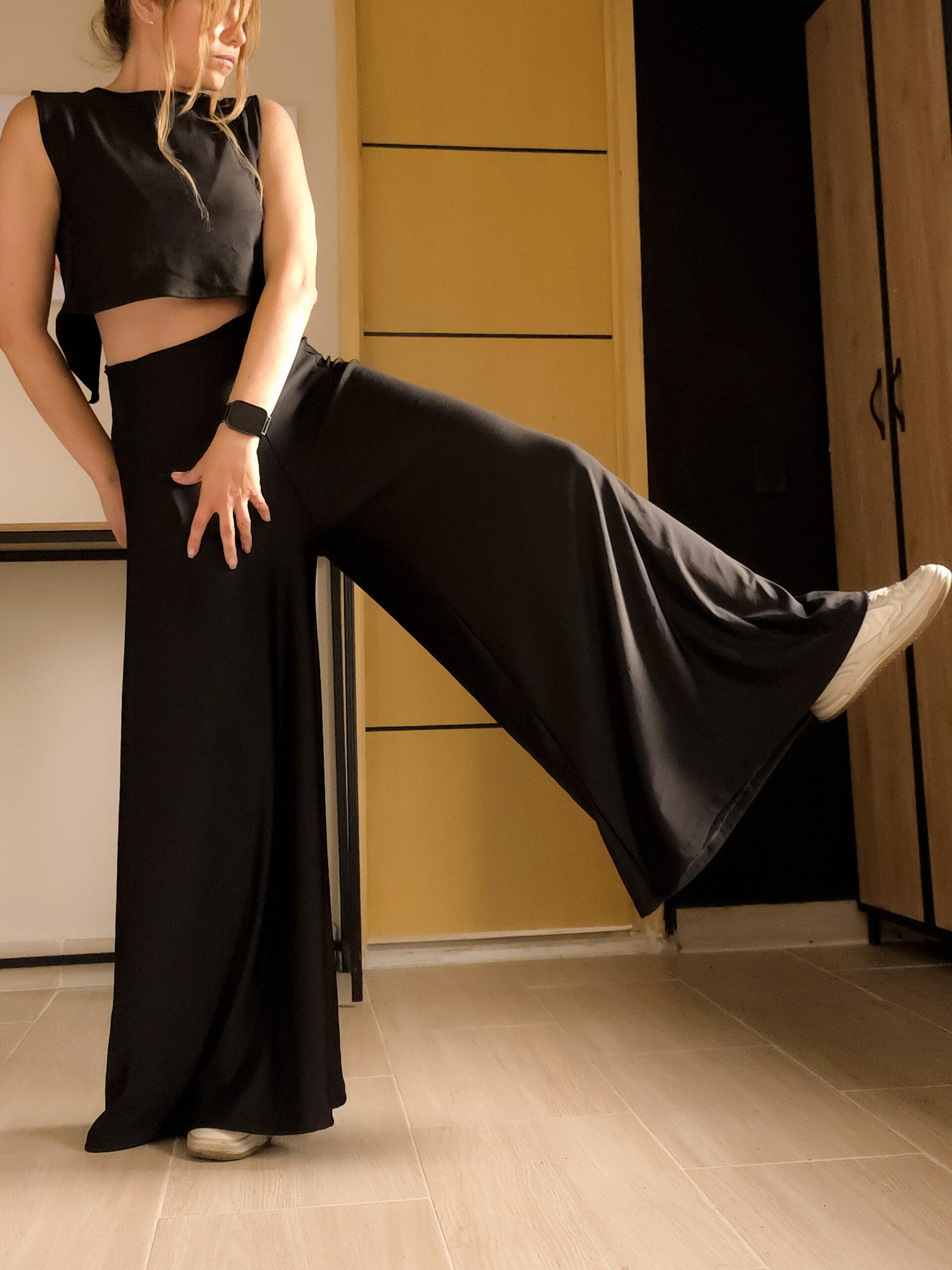 Pantalón de bota ancha estilo palazzo, con diseño fluido y tiro alto que estiliza la silueta. Su cintura sin pretina crea un acabado minimalista y cómodo, perfecto para lograr outfits modernos y relajados.
