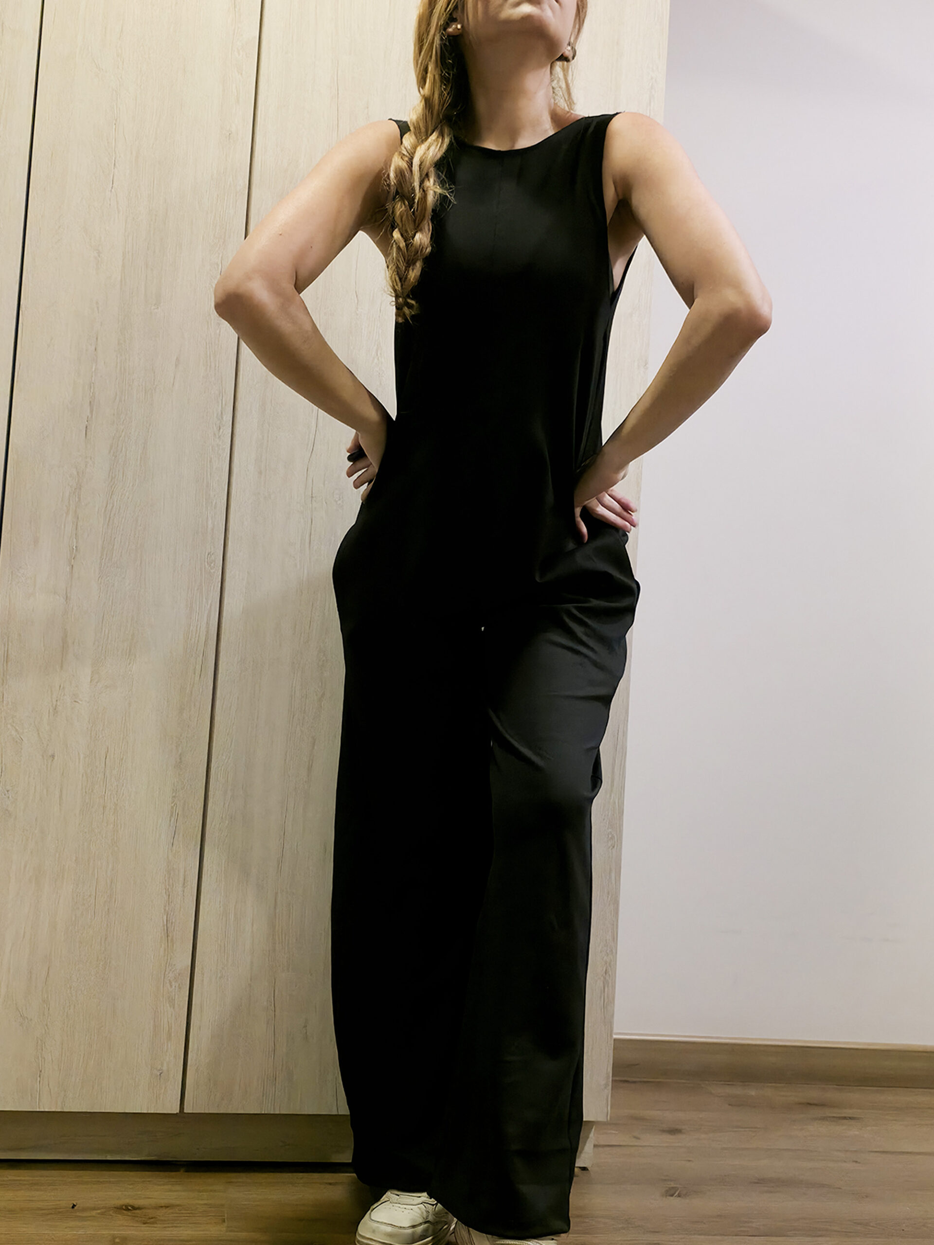 Zoe Jumpsuit súper versátil para llevar en semana o un finde, bota recta con silueta holgada escote en espalda.